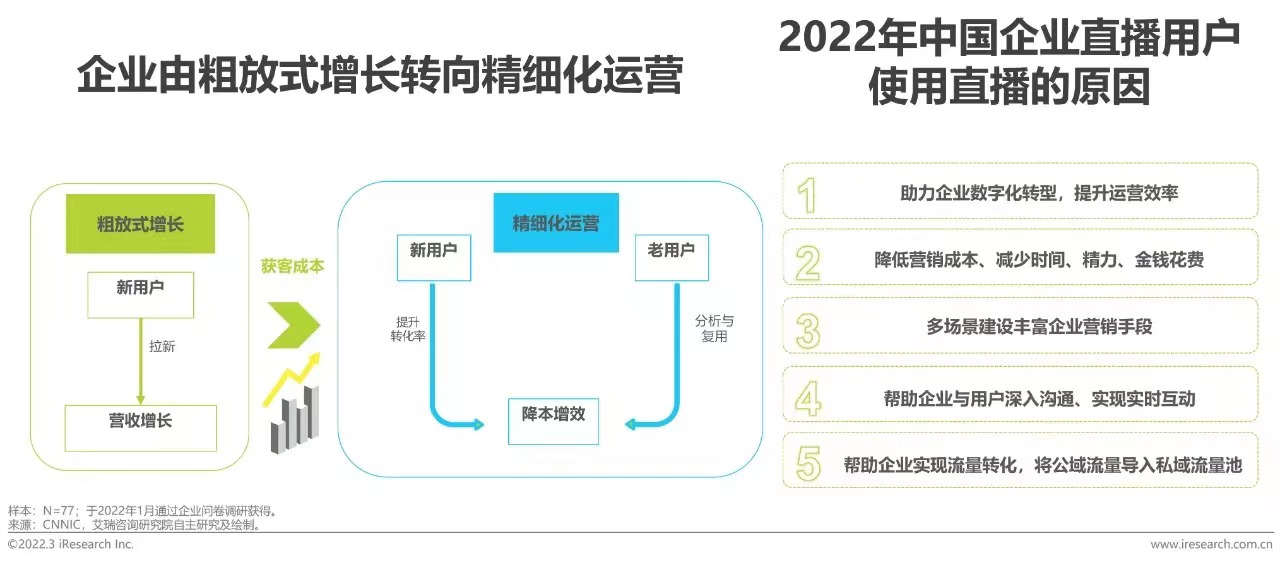 從經(jīng)濟的角度看,我國互聯(lián)網(wǎng)網(wǎng)民規(guī)?;疽呀?jīng)見頂,企業(yè)的獲客成本不斷提升,企業(yè)無序擴張的階段已經(jīng)成為歷史。如今的營商環(huán)境,更考驗每個企業(yè)的精細化運營能力,隨著獲客成本的走高,使得企業(yè)不再能單純依賴拉新來支撐業(yè)務增長,像企業(yè)直播這樣能夠以直播數(shù)據(jù)分析提升新用戶轉(zhuǎn)化率與留存率、以多樣化的直播功能深耕現(xiàn)有用戶的運營工具顯得格外重要。進入2022年,企業(yè)直播能夠幫助企業(yè)提升運營效率、節(jié)省營銷成本等特性已經(jīng)被越來越多的企業(yè)用戶所認識到。