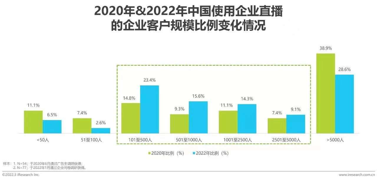 企業(yè)直播行業(yè)經(jīng)過多年的發(fā)展,現(xiàn)如今已經(jīng)較為廣泛的應用于多個行業(yè),不論是IT科技公司的新品發(fā)布會,還是央國企開展的線上培訓會議,企業(yè)直播都可以對其進行支持。本次調(diào)研中企業(yè)直播的客戶已經(jīng)涉及IT科技、醫(yī)療、房地產(chǎn)、央國企、證券、零售/消費、保險等多個行業(yè)。在對應用企業(yè)直播的企業(yè)規(guī)模進行分析時發(fā)現(xiàn),經(jīng)過2021年的演變,企業(yè)直播的價值逐漸被企業(yè)客戶所理解,中腰部規(guī)模的客戶的比例在快速提升。據(jù)調(diào)研,在使用企業(yè)直播的企業(yè)調(diào)研中,處于101-5000人規(guī)模的公司的比例均呈明顯增長趨勢。