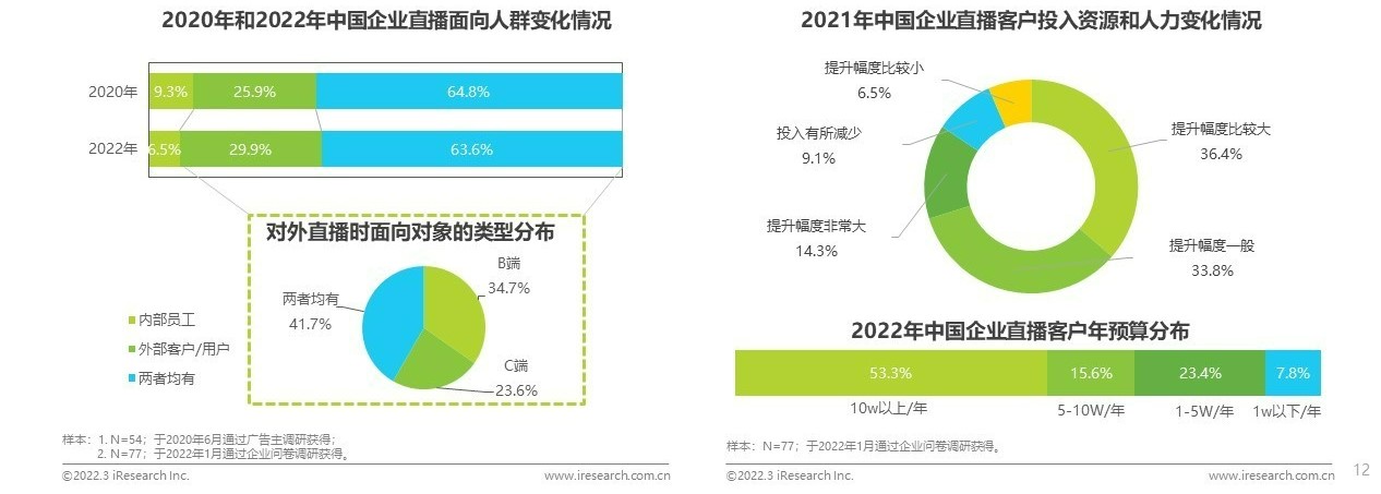 企業(yè)直播的角色逐漸轉(zhuǎn)變,對企業(yè)業(yè)務的賦能被逐漸認可,越來越多的企業(yè)不僅僅把直播做為單純的線上渠道拓展。在使用企業(yè)直播的企業(yè)中,僅單純面向內(nèi)部員工的比例進一步下降,由2020年的9.3%降至2022年的6.5%。而直播工具的應用越來越廣泛,超60%的客戶在面向內(nèi)外部時均會使用直播工具。并且,在有對外直播的用戶中有超40%均既會面向B端客戶,又會面向C端用戶進行直播,充分利用直播工具賦能業(yè)務。在調(diào)研中還發(fā)現(xiàn),2021年以來,絕大部分企業(yè)客戶對于企業(yè)直播在資金和人力等方面的投入都進一步增加了,僅有9.1%的客戶表示直播投入有所減少。同時,在企業(yè)年度直播預算分布上,53.3%的企業(yè)客戶都表示年度預算超10萬元。