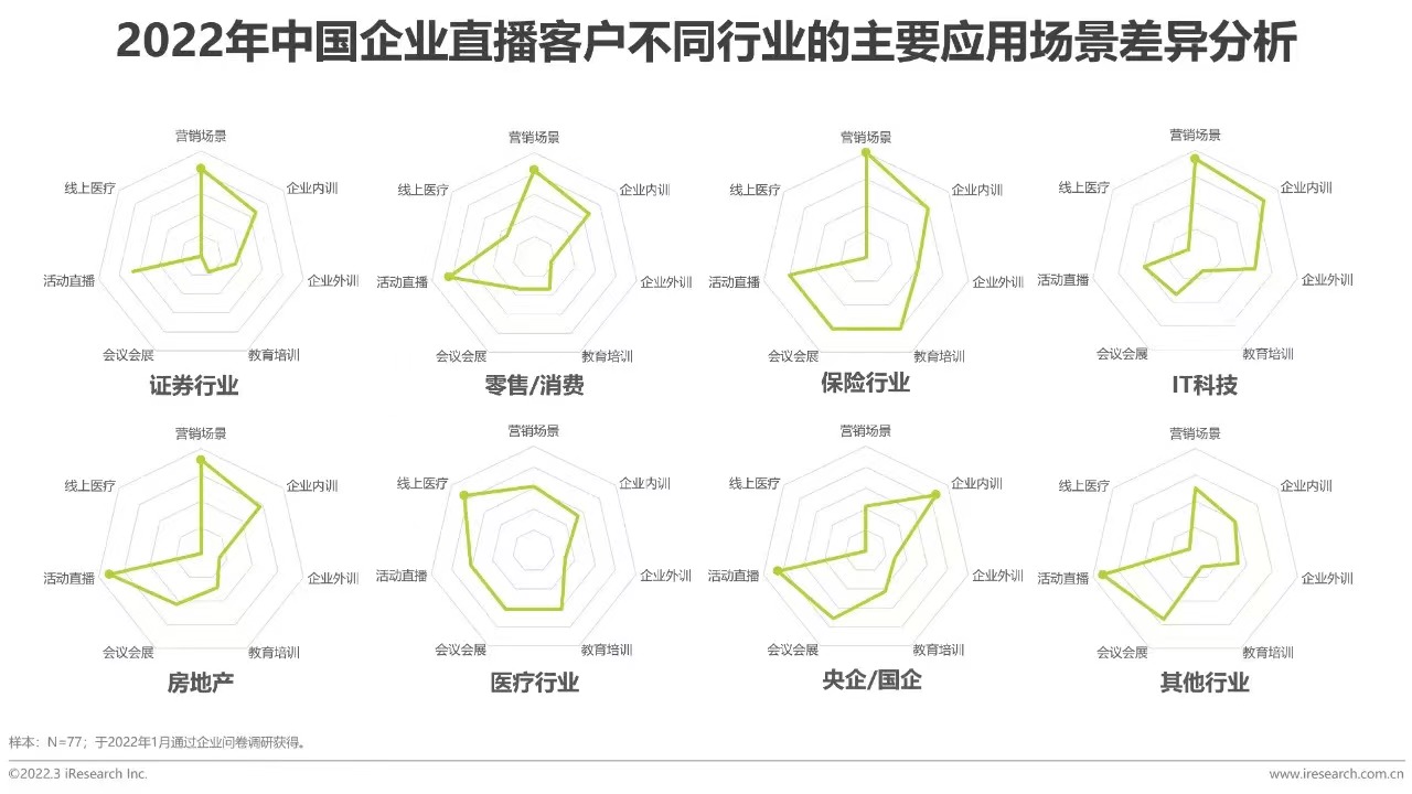 在具體的直播應用場景上,由于企業(yè)直播可以帶來較強的交互性和氛圍感,對于營銷和培訓場景的業(yè)務有極大的助推作用,因此,營銷和培訓(包括內(nèi)訓、外訓和教育培訓)也是絕對的主流應用場景,超60%的企業(yè)直播客戶都會在這兩個場景下使用企業(yè)直播這種方式。具體分析不同行業(yè)時,各個行業(yè)在應用上展現(xiàn)出了差異化的側(cè)重點。如國央企類型的企業(yè)明顯對于企業(yè)內(nèi)訓、會展會議和活動直播等場景的需求度更高;而零售/消費行業(yè)則偏重于營銷場景和活動直播兩類;以證券和保險行業(yè)為代表的金融業(yè)都更偏重于營銷場景;同時,保險和醫(yī)療行業(yè)對于會議會展的需求也比較高;房地產(chǎn)行業(yè)兼重營銷和活動直播兩類場景;IT科技類企業(yè)則比較偏向于營銷和企業(yè)內(nèi)訓場景。