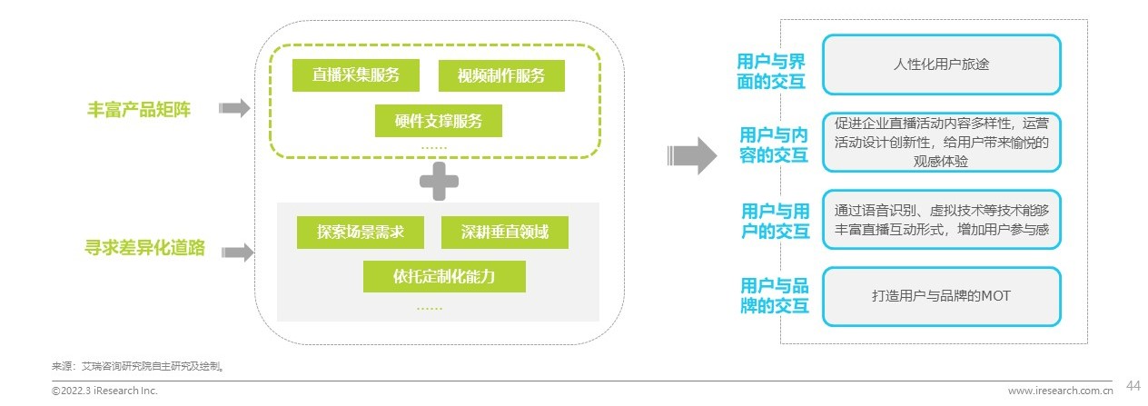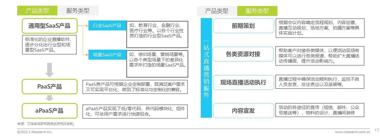 企業(yè)直播的產(chǎn)品由通用性的SaaS產(chǎn)品分化出行業(yè)型和場景型的SaaS產(chǎn)品,以更好滿足特定行業(yè)/場景下用戶的差異化需求。此外,對于付費能力更強、個性化要求更高的企業(yè)也逐漸演變出了可定制的PaaS類直播產(chǎn)品,并隨著低代碼技術的發(fā)展衍生出了aPaaS類直播產(chǎn)品,通過模塊化、組件化代碼幫助客戶提供更靈活的定制化直播服務。此外,直播產(chǎn)品往往也是與企業(yè)直播服務一同銷售,根據(jù)客戶的需要,企業(yè)直播服務商可提供從前期策劃到內(nèi)容宣發(fā)的一站式全鏈路營銷服務,覆蓋了企業(yè)直播的前中后階段,最大程度幫助企業(yè)客戶使用好企業(yè)直播這個工具。