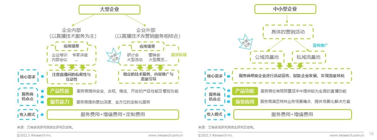 大型企業(yè)開展企業(yè)直播的業(yè)務主要涵蓋企業(yè)內(nèi)外訓和營銷服務,應用場景更為多元,涉及專家講座、研討會、發(fā)布會、展覽等多個場景;中小型企業(yè)一般用企業(yè)直播進行具體的營銷活動、尋求雙域流量轉(zhuǎn)化。因此,大型企業(yè)的核心訴求主要是穩(wěn)定的技術服務和定制化營銷服務,集中在產(chǎn)品性能側(cè)和服務商能力側(cè);而中小型企業(yè)因資金、人力等成本相對有限,更看重產(chǎn)品的基礎功能實現(xiàn)和特殊業(yè)務場景應用能力。