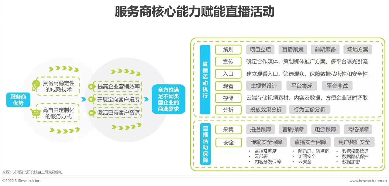 企業(yè)直播服務商具備穩(wěn)定成熟的技術和定制化服務的能力,依托自建團隊和生態(tài)合作,其服務能夠貫穿直播活動全流程,從執(zhí)行和保障兩個維度,涵蓋策劃、宣傳、數(shù)據(jù)采集多個方面,確保企業(yè)直播的穩(wěn)定性、私密性和安全性。同時,專業(yè)的服務商還擁有強大的媒體資源和推廣能力,能夠幫助企業(yè)優(yōu)化營銷進程,定向拓展和激活客戶資源,為企業(yè)提供切入更多細分場景的深度服務,全方位滿足不同類型企業(yè)的商業(yè)需求。