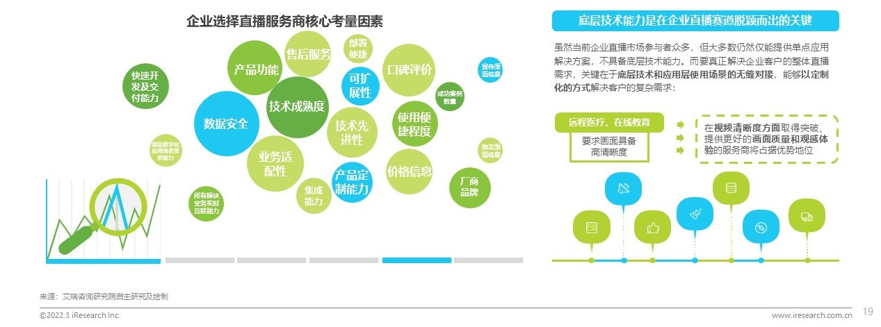 企業(yè)選擇直播服務商時,考量維度比較全面,涉及技術、服務、價格、品牌多個方面,技術成熟度、數(shù)據(jù)安全、產(chǎn)品功能、業(yè)務適配性是首要考慮的因素。雖然目前企業(yè)直播賽道競爭激烈,但是大部分服務商仍然停留在單點應用層面,不具備底層技術和多元使用場景相結合、定制化解決客戶復雜需求的能力。因此可以預見,未來擁有底層技術能力、能夠提供更多細分場景深度解決方案的服務商將更可能擁有差異化競爭優(yōu)勢。