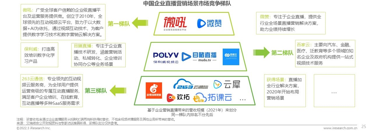 企業(yè)直播營銷場景可應用于多個行業(yè),是眾多企業(yè)直播服務商布局的主要場景。盡管當前營銷場景下的服務商數(shù)量眾多,但能在細分行業(yè)中布局的服務商仍在少數(shù)。整體來看,第一梯隊企業(yè)服務商專注于搭建多樣化的營銷場景,其直播產(chǎn)品及服務會針對不同的行業(yè)進行深度匹配;第二梯隊服務商在在營銷方面的營收占比及用戶體量均與第一梯隊存在差距;第三梯隊的服務商最多,部分企業(yè)規(guī)模稍小,也有部分企業(yè)在其他賽道具有各自的優(yōu)勢,只是目前營銷賽道投入不高,來自營銷場景的收入占比有待提升。