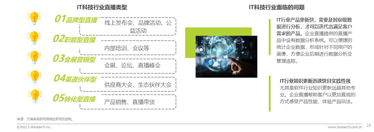 IT科技行業(yè)企業(yè)直播已進入3.0全連接時代。對于IT科技行業(yè)相關公司來說,行業(yè)具有產(chǎn)品更新快,行業(yè)知識更新迅速且實踐性強等特征。企業(yè)直播服務商為其提供從直播技術及深度服務,通過專業(yè)的內(nèi)容營銷、輔助多樣化的運營活動,切入數(shù)據(jù)分析系統(tǒng),幫助企業(yè)實現(xiàn)營銷破局。此外,得益于行業(yè)的特殊性,IT互聯(lián)網(wǎng)行業(yè)是企業(yè)直播滲透效果最佳的行業(yè)之一,已經(jīng)發(fā)展到利用直播建設數(shù)字營銷閉環(huán)的下一個階段。IT科技行業(yè)直播類型可分為:品牌型直播、職能型直播、會展營銷型直播、渠道伙伴型直播、轉(zhuǎn)化型直播,多場景多類型直播協(xié)同發(fā)展幫助企業(yè)實現(xiàn)營銷破局。