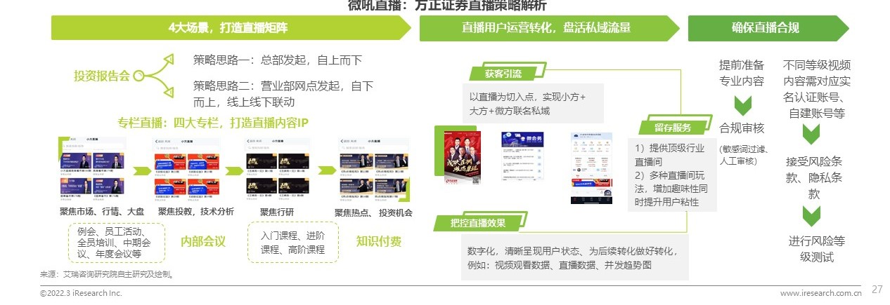 方正證券作為國內(nèi)主流券商之一,通過企業(yè)直播打造數(shù)字化組合業(yè)務。用戶側(cè)升級客戶服務、企業(yè)側(cè)私域流量運營轉(zhuǎn)化,通過三步走策略助力業(yè)務增長、提高品牌影響力。第一步,建立4大直播場景打造直播矩陣。企業(yè)對觀看直播的客戶群體進行分類,針對投資鏈的不同環(huán)節(jié)及不同話題,打造差異化的直播類型。在打造不同專欄節(jié)目的同時,也注重打造直播IP形象,企業(yè)深刻的認知到直播形象人格化更容易拉近產(chǎn)品與消費者的心理距離,產(chǎn)生兼容性實現(xiàn)轉(zhuǎn)化。第二步, 直播用戶運營及轉(zhuǎn)化盤活私域流量。證券行業(yè)本身就天然具備私域運營的優(yōu)勢——網(wǎng)點多、員工多、客戶多便于搭建方正私域運作體系,實現(xiàn)營銷轉(zhuǎn)化。第三步, 平臺更好的協(xié)同+更好的合規(guī),助力企業(yè)搶占直播紅利。