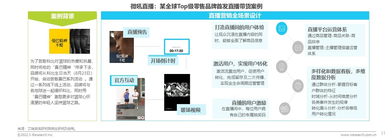 受新冠疫情的影響,直播在零售業(yè)中掀起了直播帶貨全民熱潮,企業(yè)通過直播來帶動銷售、沉淀口碑。以微吼直播典型客戶——某全球Top級零售品牌為例,在紀念科比事件的背景下,品牌發(fā)起了一場私域直播活動?;谄放谱陨頁碛旋嫶蟮挠脩趔w系和粉絲體系,微吼根據(jù)品牌需求定制化生成了一套專屬方案。比如,直播活動化廣告、推屏設置、留言審核、購買和抽獎,以及抽盲盒活動等?;顒又械膭?chuàng)意內(nèi)容在直播平臺上通過技術賦能都可以實現(xiàn)。企業(yè)直播服務商的營銷解決方案加速了零售行業(yè)的數(shù)字化進程,成為助力商業(yè)營銷的重要手段。