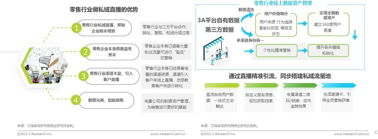 隨著移動互聯(lián)網(wǎng)進入到下半場,從流量紅利時代步入到存量時代,利用直播進行產(chǎn)品沉淀成為電商的新方向。直播也成為了消費者購物的重要渠道、企業(yè)解決銷售推廣難題的營銷利器。零售行業(yè)進行直播的價值在于:1)幫助企業(yè)引流用戶,提升復購率。通過前期的直播策劃宣傳、中期的直播間帶貨,到后期的智能客情分析等,全面貫穿企業(yè)的線上營銷全流程。豐富的在線互動與即時答疑等方式,提高用戶粘性,盤活私域流量。2)場景化屬性強,實現(xiàn)全場景全域營銷。其中,直播平臺自有數(shù)據(jù)平臺的搭建更好的賦能零售行業(yè)數(shù)據(jù)資產(chǎn)管理,建立用戶畫像,實現(xiàn)個性化精準運營,賦能銷售進一步提升。
