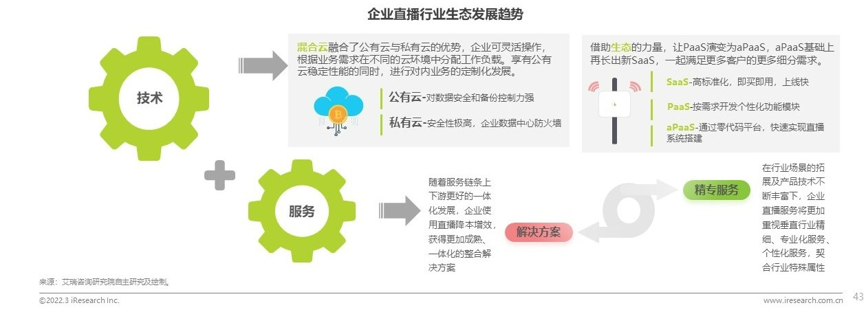 2022年越來越多的服務廠商從直播技術公司轉(zhuǎn)型為直播運營公司,技術與服務的雙輪推動助力企業(yè)直播公司轉(zhuǎn)型。技術層方面,隨著中國云計算市場的不斷發(fā)展,公有云與私有云基于數(shù)據(jù)安全需求,推動生成混合云幫助企業(yè)穩(wěn)定底層技術;在直播系統(tǒng)搭建方面,從SaaS標準化到PaaS、aPaaS個性化,底層技術閉環(huán)化發(fā)展全方面的滿足企業(yè)對直播系統(tǒng)搭建需求。服務層方面,直播服務商將從不同行業(yè)特殊性及行業(yè)痛點出發(fā),有針對性的提供更加精細化、專業(yè)化的服務,并且針對不同企業(yè)提供一站式的個性化解決方案。“技術+服務”助力企業(yè)直播服務廠商朝著更加專業(yè)化、成熟化方向發(fā)展。