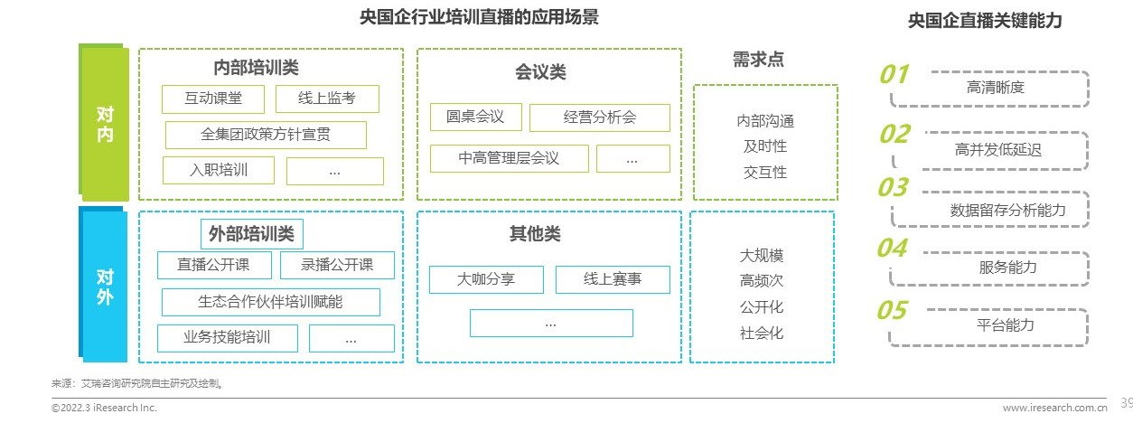 中大型的國有企業(yè)往往人員規(guī)模較大,分支機構較多,內(nèi)部與外部的溝通和傳達變得非常重要。利用企業(yè)直播這種形式,可以有效地幫助央國企實現(xiàn)企業(yè)內(nèi)部培訓和在線會議的實時交流與溝通,具有較強的交互性;同時,在面對央國企的外部客戶/用戶時,又可利用企業(yè)直播工具對外部用戶和合作伙伴展開培訓,并以直播為載體實現(xiàn)線上賽事等多樣性活動的舉辦。通過對外多樣的溝通交流既可以幫助央國企實現(xiàn)培訓用戶/客戶,進一步又可以幫助央國企強化品牌形象。
