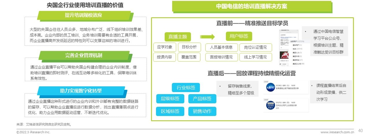 企業(yè)培訓直播對于央國企來說既是提升培訓規(guī)模效應的有效方式,又可以幫助企業(yè)完善內(nèi)訓制度、提升管理效能的工具,還可以幫助企業(yè)實現(xiàn)數(shù)字化轉(zhuǎn)型,以直播數(shù)據(jù)為基礎實現(xiàn)迭代優(yōu)化的路徑。以中國電信企業(yè)直播解決方案為例,企業(yè)直播服務提供商針對其業(yè)務上的特點,推出了注重用戶分級推送、培訓數(shù)據(jù)留存的直播工具。企業(yè)直播服務商深入結合央國企的行業(yè)特征,實現(xiàn)精準推送和線索留存等功能設計,助力央國企提升運營效率。