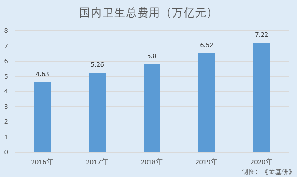 據(jù)東方財(cái)富Choice數(shù)據(jù),2016-2020年,國內(nèi)衛(wèi)生總費(fèi)用分別為4.63萬億元、5.26萬億元、5.8萬億元、6.52萬億元、7.22萬億元。