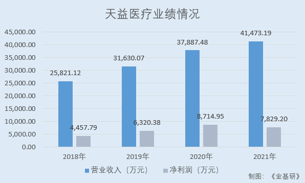 據(jù)招股書,2018-2021年,天益醫(yī)療的營業(yè)收入分別為2.58億元、3.16億元、3.79億元、4.15億元,凈利潤分別為4,457.79萬元、6,320.38萬元、8,714.95萬元、7,829.2萬元。