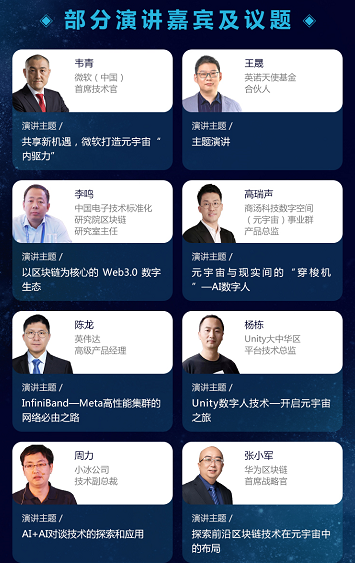 此次活動(dòng)特別邀請了10余位頭部科技公司技術(shù)大咖,包括微軟(中國)首席技術(shù)官韋青、小冰公司技術(shù)副總裁周力、英偉達(dá)高級(jí)產(chǎn)品經(jīng)理陳龍、Rokid產(chǎn)品技術(shù)總監(jiān)趙維奇、商湯科技數(shù)字空間事業(yè)群產(chǎn)品總監(jiān)高瑞聲等;同時(shí)邀請了10余位行業(yè)內(nèi)知名專家及科研學(xué)者,包括中國電子技術(shù)標(biāo)準(zhǔn)化研究院區(qū)塊鏈研究室主任李鳴、IEEE計(jì)算機(jī)協(xié)會(huì)區(qū)塊鏈秘書長郝玉琨、中國首位游戲設(shè)計(jì)博士黃石、虛擬空間學(xué)者及科幻作者王寬等;另外也邀請了眾多獨(dú)角獸型創(chuàng)業(yè)企業(yè)家,包括光輝城市公司創(chuàng)始人兼CEO宋曉宇、觸角科技有限公司聯(lián)合創(chuàng)始人谷強(qiáng)等。多位重量級(jí)嘉賓將為廣大參會(huì)者分享元宇宙各個(gè)領(lǐng)域技術(shù)的落地實(shí)踐經(jīng)驗(yàn),把脈元宇宙技術(shù)及行業(yè)的未來發(fā)展趨勢,范圍涵蓋元宇宙技術(shù)本身、場景應(yīng)用領(lǐng)域的現(xiàn)狀和未來前景,精彩內(nèi)容不容錯(cuò)過!
