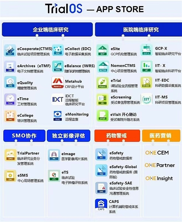 TrialOS平臺集成了30余款臨床試驗SaaS軟件,統(tǒng)一登錄入口,覆蓋臨床試驗全程,支持BE/I-III期以及RWE、IIT等各類上市后研究。服務(wù)于申辦方、機構(gòu)、第三方服務(wù)商等試驗各參與方,讓各方免于在海量軟件中反復(fù)篩選試錯的痛苦。