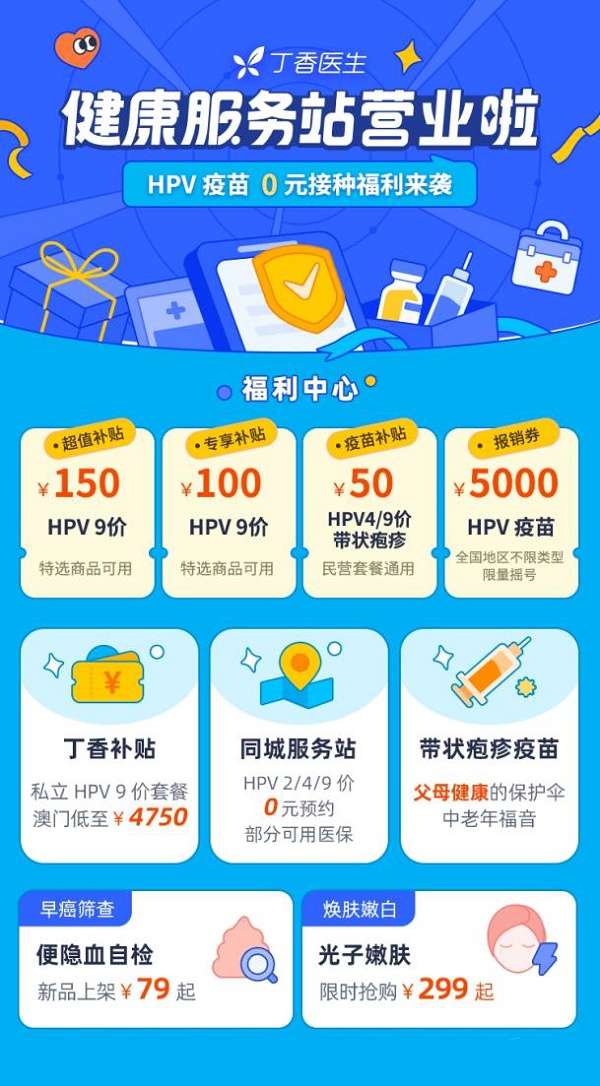 為呼吁更多用戶接種疫苗、享受健康生活,丁香醫(yī)生宣布即日起上線“健康服務(wù)站”活動,將于4月12日-15日活動期間推出一系列優(yōu)惠活動,針對HPV、帶狀皰疹等眾多熱門疫苗開展補(bǔ)貼、報銷、科普直播立減等組合式福利。有疫苗接種計劃的用戶可直接登陸丁香醫(yī)生App或小程序,進(jìn)入活動聚合頁了解詳情。