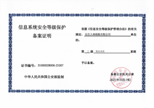 通過近3個月緊鑼密鼓的安全測評和風(fēng)險整改工作,長生人壽于2012年7月16日收到評測機(jī)構(gòu)的“等級保護(hù)第三級”評測合格報告。經(jīng)過上海市公安局縝密詳實的備案審核,長生人壽于2021年11月1日正式收到公安機(jī)構(gòu)批準(zhǔn)的信息系統(tǒng)安全等級保護(hù)三級備案證明。