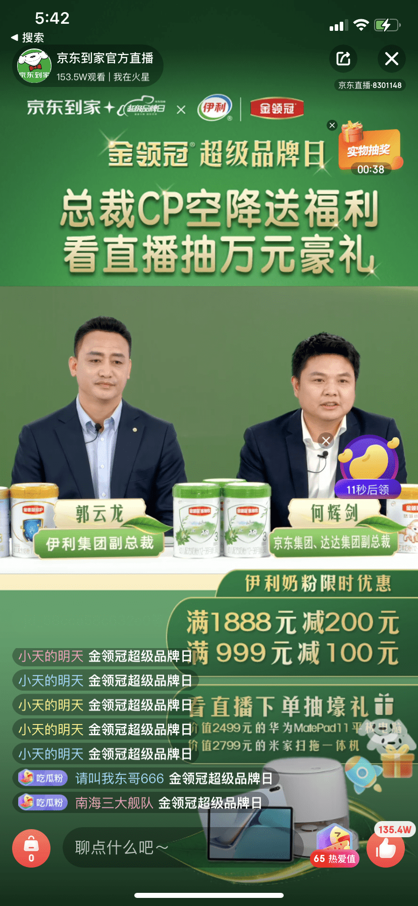 4月16日,在京東到家與伊利金領(lǐng)冠聯(lián)合打造的“超級品牌日”直播活動中,伊利集團(tuán)副總裁郭云龍和達(dá)達(dá)集團(tuán)、京東集團(tuán)副總裁何輝劍受邀組成“總裁CP”空降京東到家直播間,為觀看直播的消費(fèi)者們帶來了巨大驚喜,也將本次京東到家415同城購物節(jié)活動推向了高潮。