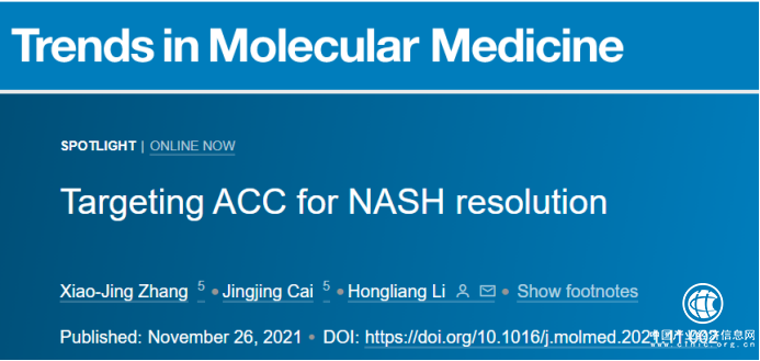 2022年1月28日,國(guó)際權(quán)威雜志Trends in Molecular Medicine特邀武漢大學(xué)李紅良教授發(fā)表評(píng)論文章,題為“Targeting ACC for NASH resolution”。該文章深入解析了靶向ACC治療NASH的臨床應(yīng)用前景和困境,評(píng)述了Nature Medicine最近發(fā)表的輝瑞公司ACC抑制劑治療NASH的臨床試驗(yàn)進(jìn)展,更提出了靶向ACC治療NASH的新方向和新理念。