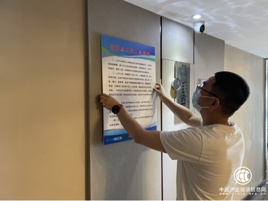 圖為:被抽調(diào)的東陽市煙草專賣局工作人員馬海嘯(右)正在對集中隔離點外部進行相關(guān)警示牌張貼工作