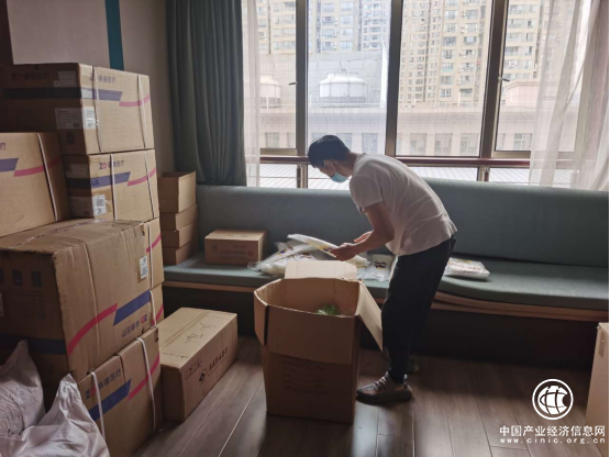 圖為:馬海嘯正在集中隔離點物資倉庫內(nèi)清點物資