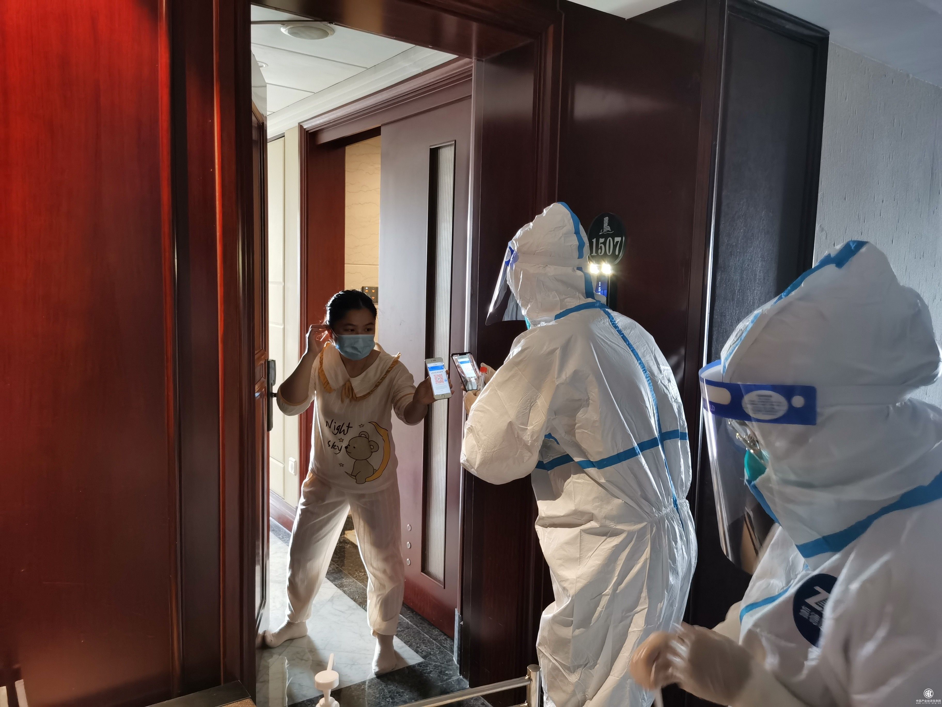 一早,我們就穿戴好防護服到各個房間做核酸采集,每一次按門鈴迎接我們的都是“英雄們”熱情洋溢的表情,他們專業(yè)精神使得我們工作開展的異常的順利。