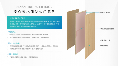 作為一家新型綠色建材體系的高科技企業(yè),安必安一直專注于防火門芯的研發(fā)與生產(chǎn)。安必安木質(zhì)防火門采用一體門芯結(jié)構(gòu)方式,具有耐火、無醛無毒、隔音性能好等優(yōu)點(diǎn),廣泛用于醫(yī)院、酒店、公共場所防火通道等場所。
