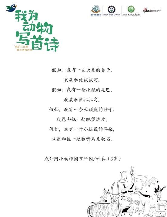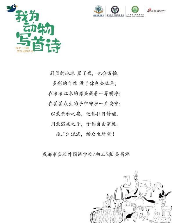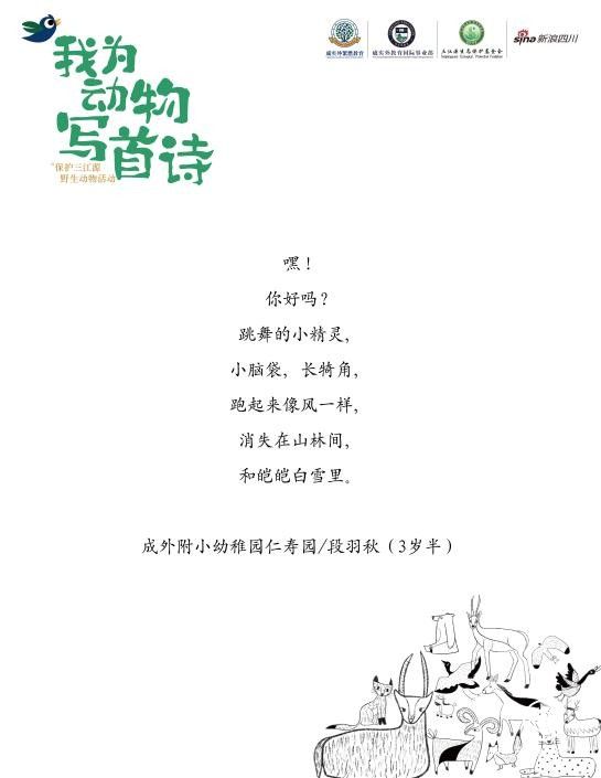 4月12日-4月20日,成實(shí)外繁懋教育、成外國際部、實(shí)外國際部、新浪四川共同開展了“我為動物寫首詩”的文化創(chuàng)作征集活動,共收到來自不同學(xué)校、不同年齡的孩子們的數(shù)百封投稿作品,這些短詩圍繞著與動物的“對話”開展,有了更豐富和生動的表達(dá)意蘊(yùn)?!拔野巡亓缪虍嬙诩埳希诳瞻椎牡胤?,填滿藍(lán)色和綠色,這樣它和它的朋友就能自由奔跑了”這是來繁懋教育小橡樹托育中心的彭奕航小朋友短詩,也是他送給藏羚羊的祝福。據(jù)了解,在后期,部分作品也將被印刷為公益詩冊和在三江源生態(tài)保護(hù)基金會公開發(fā)行的《三江源生態(tài)》雜志刊登。