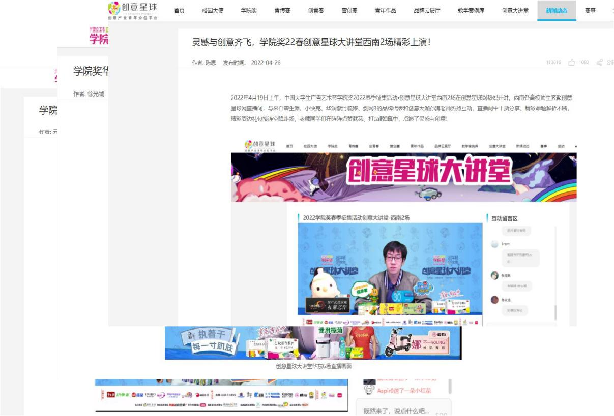 從3月24日華東1場(chǎng)開(kāi)始,到4月28日網(wǎng)易全國(guó)場(chǎng)結(jié)束,一個(gè)月多的時(shí)間,學(xué)院獎(jiǎng)創(chuàng)意星球大講堂在創(chuàng)意星球網(wǎng)及網(wǎng)易直播平臺(tái)上,開(kāi)設(shè)了31場(chǎng)線上創(chuàng)意課,來(lái)自全國(guó)各地高校的參賽師生們?cè)诰€聽(tīng)課。
