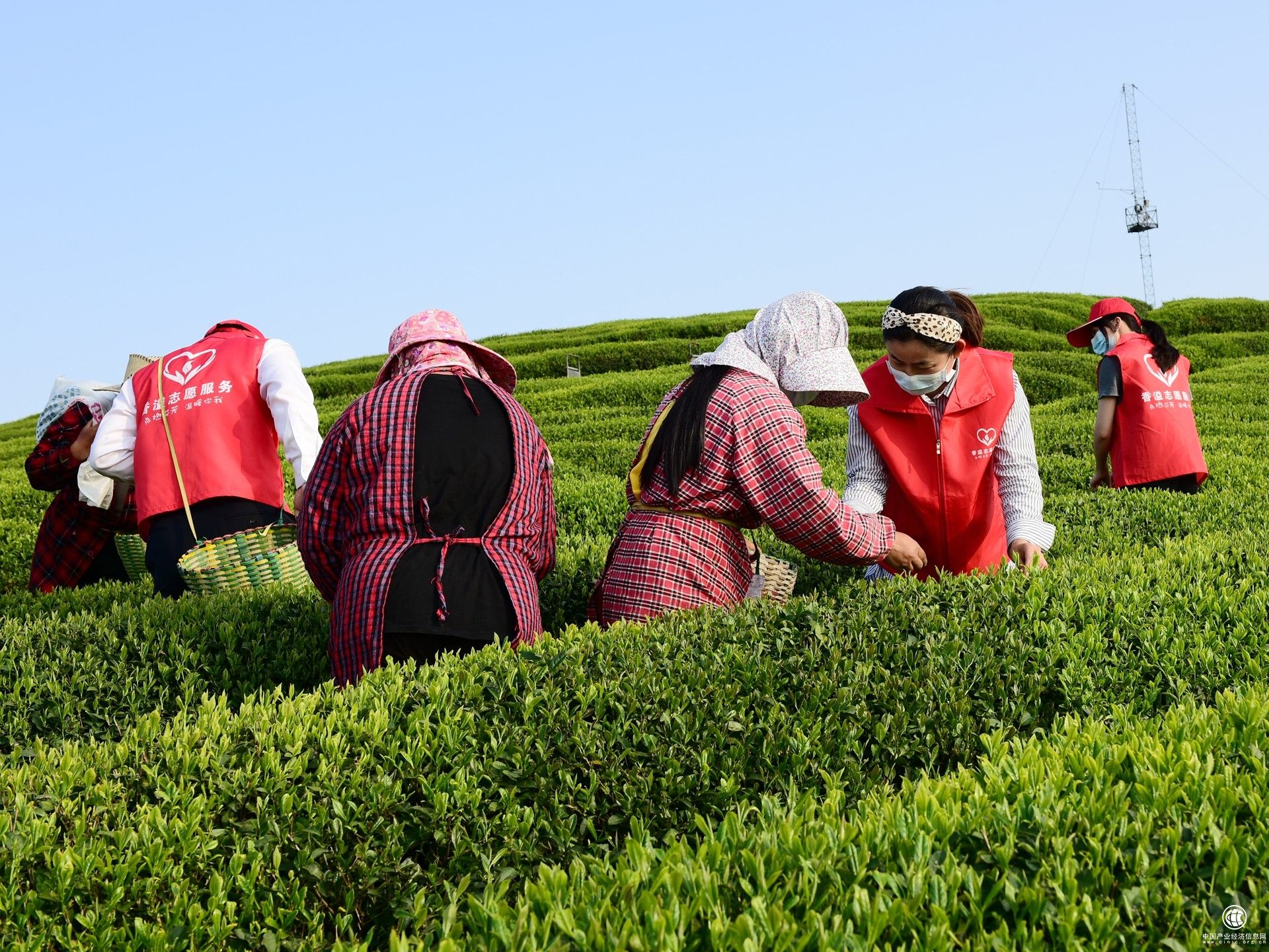 今年因?yàn)橐咔槎帱c(diǎn)頻發(fā),導(dǎo)致工人短缺,加上茶葉的采摘期又很短,老陳望著自己的茶園愁容滿面。這不,青年志愿者們提前學(xué)習(xí)好采茶技術(shù),變身“采茶工”,結(jié)隊(duì)前往茶園,為客戶的茶葉采摘盡一份綿薄之力?!凹饶軒头隹蛻簦挚梢詫W(xué)到很多知識(shí),累更快樂(lè)著,我覺(jué)得很有意義?!敝驹刚咝±钅四~頭的汗水,笑著說(shuō)道。