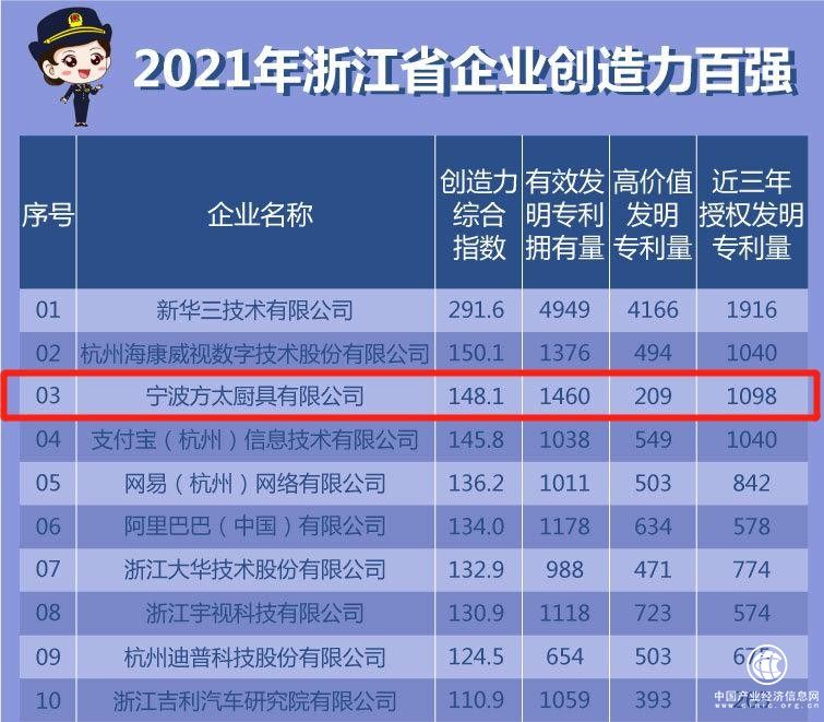 近日,浙江省市場監(jiān)管局發(fā)布了省創(chuàng)造力百強(qiáng)企業(yè)榜單,以2021年底數(shù)據(jù)為基準(zhǔn)對省內(nèi)企業(yè)創(chuàng)造力進(jìn)行評價排名,高端廚電領(lǐng)軍品牌方太在一眾互聯(lián)網(wǎng)和高新技術(shù)企業(yè)中脫穎而出,以創(chuàng)造力綜合指數(shù)148.1、有效發(fā)明專利擁有量1460件、高價值發(fā)明專利量209件、近三年授權(quán)發(fā)明專利量1098件的突出表現(xiàn)高居榜單第三,超過同期登榜的支付寶、網(wǎng)易和阿里巴巴、大華等。