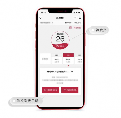 此外,小仙燉還創(chuàng)新推出周期滋補(bǔ)服務(wù)模式,引入周期訂閱服務(wù),用戶按年、按月訂購,小仙燉每周新鮮燉煮、冷鮮配送。同時(shí),小仙燉開發(fā)了“自助發(fā)貨調(diào)整“小程序,實(shí)現(xiàn)了用戶需求與生產(chǎn)計(jì)劃的精準(zhǔn)匹配,用戶可以隨時(shí)修改自己的發(fā)貨時(shí)間和收貨地址,在休假、出差等場景隨意切換,幫助用戶在快節(jié)奏的生活中養(yǎng)成周期規(guī)律服用的滋補(bǔ)習(xí)慣。