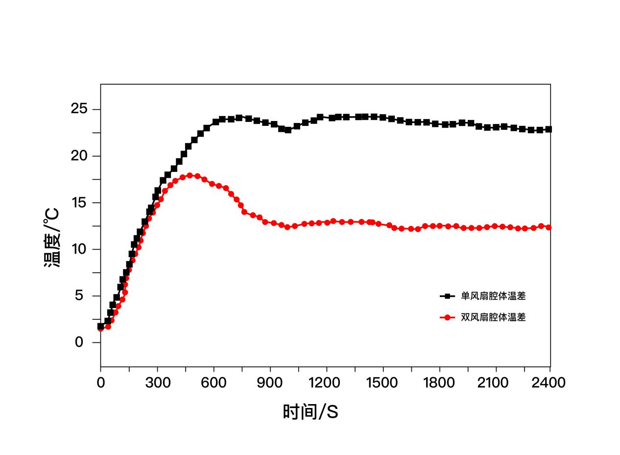 如上圖所示,在同等條件下單熱風(fēng)的腔體測得最大溫差24.8℃左右,穩(wěn)定后的溫差22.6℃左右,而雙風(fēng)扇對流腔體最大溫差比單熱風(fēng)減小30.2%左右,穩(wěn)定后的溫差比單風(fēng)扇降低45%左右。