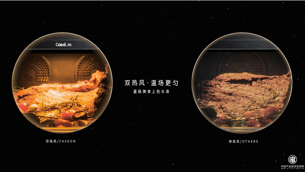 之所以有這樣的設(shè)計,是基于凱度對市場上小容量蒸烤集成灶核心痛點的洞察:首先,集成灶蒸烤腔為“火柴盒”型的矩形設(shè)計,這種設(shè)計如果容量太小,深度不夠的話,很難裝下帝王蟹、澳龍、烤羊腿等大塊食材;其次,一般集成灶的蒸烤腔邊框都在15cm以上,甚至是20cm,這既浪費掉了大量空間,也高度影響了產(chǎn)品的美觀性,即使是走大容量路線的蒸烤集成灶容量通常也僅有60L;再者,這種腔體左右間距非常大,如果只是單熱風(fēng),很容易造成食材受熱不均勻,比如烤羊腿,這頭烤焦了,那頭可能還是夾生的。