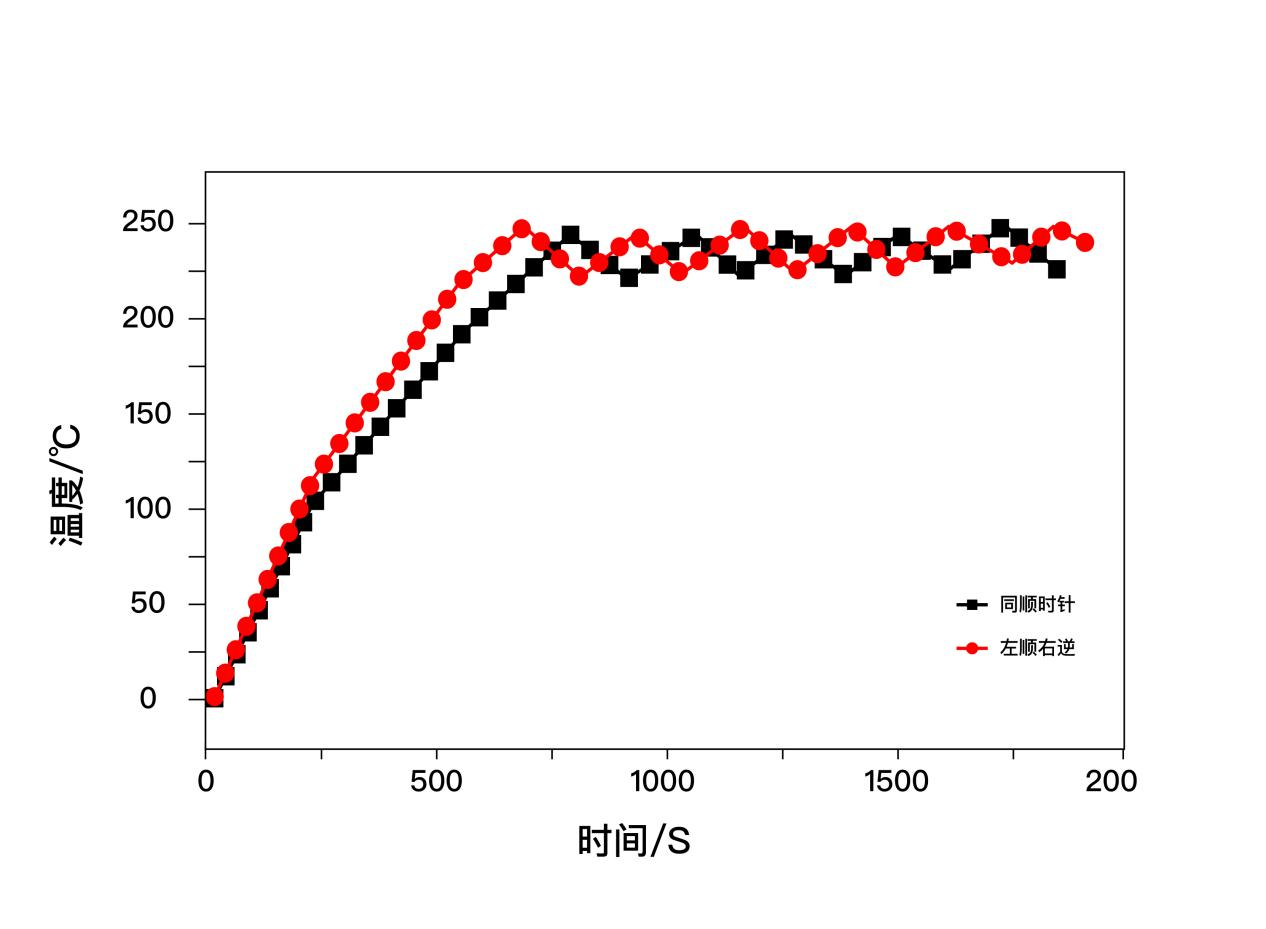 從上圖可以窺探,雙熱風(fēng)帶來的并不是將一個風(fēng)機的動能簡單加倍,它采用的左順右逆的旋轉(zhuǎn)方式,與雙風(fēng)扇同順時針的旋轉(zhuǎn)方式相比,前者腔體中心升溫速度提升17%左右。