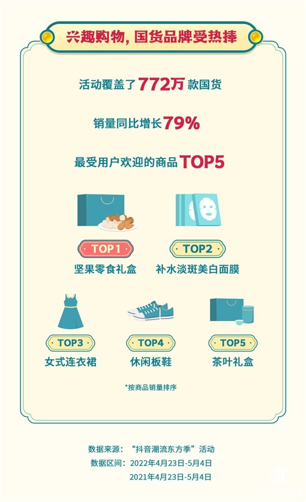 4月23日至5月4日,為期12天的“抖音潮流東方季”活動(dòng)收官,該活動(dòng)聚焦國(guó)貨、老字號(hào)、傳統(tǒng)手工藝品,滿足消費(fèi)者在衣食住行各方面的購(gòu)物需求。活動(dòng)期間,該平臺(tái)國(guó)貨銷量穩(wěn)定走高,同比增長(zhǎng)79%。其中,漢服深受用戶青睞,銷量同比增長(zhǎng)312%。