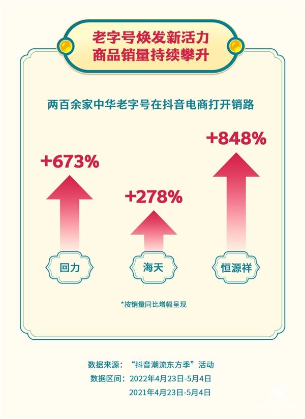 隨著國(guó)貨消費(fèi)需求不斷升級(jí),傳統(tǒng)老字號(hào)也在傳承與創(chuàng)新中變身“新國(guó)潮”。據(jù)悉,已有兩百余家中華老字號(hào)通過(guò)抖音電商打開了新銷路。在“抖音潮流東方季”活動(dòng)推動(dòng)下,回力、海天、恒源祥銷量成倍數(shù)增長(zhǎng),同比增幅達(dá)673%、278%和848%。