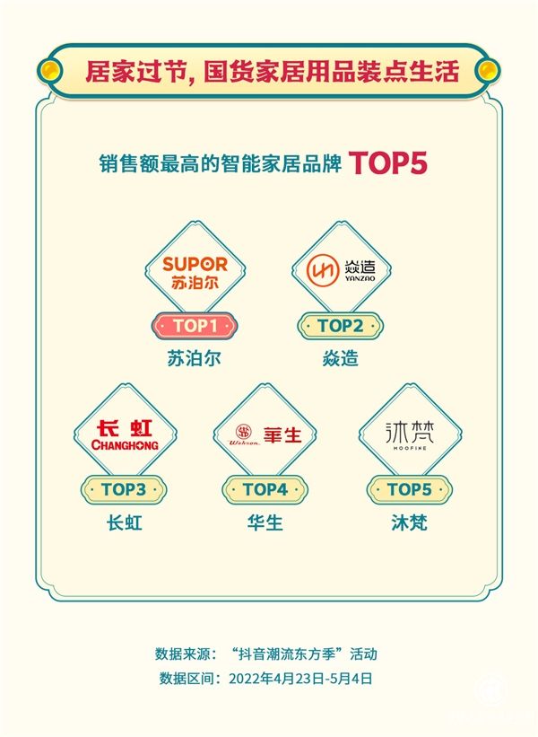 “抖音潮流東方季”活動(dòng)正值五一假期,大眾對(duì)智能家居用品消費(fèi)熱情高漲。家用多功能鍋、電風(fēng)扇、家紡用品等成為裝點(diǎn)美好生活的潮品。蘇泊爾、焱造、長(zhǎng)虹、華生和沐梵等智能家居品牌銷售火熱,整體銷售額位居前列。