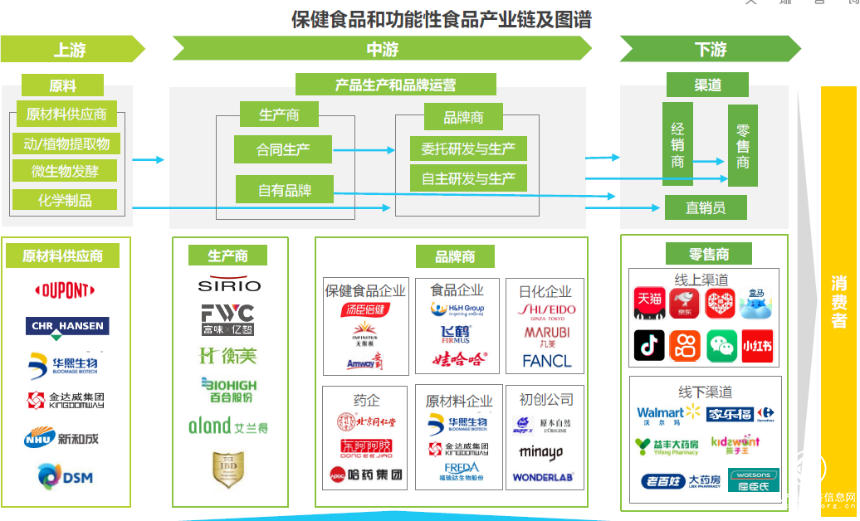 功能性食品產業(yè)鏈條上,上游原料端的參與者主要有動植物提取物、生物發(fā)酵、化學提取物等企業(yè),屬于技術、資金、商業(yè)環(huán)節(jié)壁壘較高的環(huán)節(jié)。一款新型功能性原料在應用到消費市場前,需經過長時間的基礎研究和臨床實驗及數(shù)據驗證,此外還需通過國家相應的行政審批,獲得審批后,才可以在相應的產品類別中進行商業(yè)化應用。