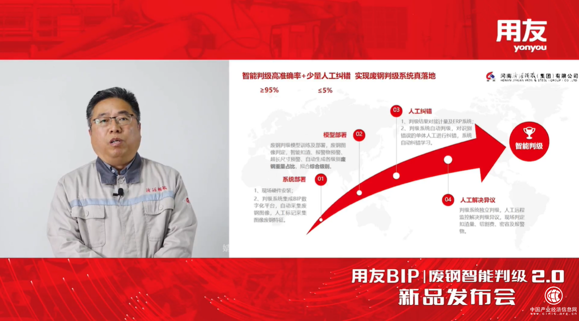 用友通過數(shù)據(jù)智能為制造企業(yè)提質增效,實現(xiàn)綠色低碳,廢鋼智能判級就是工業(yè)互聯(lián)網(wǎng)的一個典型應用。5月13日,用友面向鋼鐵行業(yè),發(fā)布用友BIP廢鋼智能判級2.0新產(chǎn)品,創(chuàng)新廢鋼判級場景,以此解決傳統(tǒng)廢鋼驗質過程中環(huán)境惡劣、工作強度大、感情驗質、摻假作弊、難以追溯等難題。作為行業(yè)領先的廢鋼智能判級系統(tǒng),“用友BIP廢鋼智能判級2.0”判級更準確、場景更全面、交付更快速,準確率達95%以上,將為鋼鐵企業(yè)帶來巨大的經(jīng)濟效益,并推動鋼鐵行業(yè)向智能化發(fā)展。