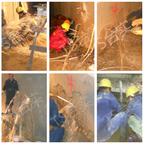 臺(tái)實(shí)接到管廊搶險(xiǎn)通知,高層領(lǐng)導(dǎo)非常重視,險(xiǎn)情就是命令,工程技術(shù)人員毫不猶豫組織隊(duì)伍、設(shè)備,連夜奔赴搶險(xiǎn)一線,采用化學(xué)灌漿技術(shù),迅速展開(kāi)管廊透水救生修繕工作。臺(tái)實(shí)根據(jù)豐富的實(shí)戰(zhàn)經(jīng)驗(yàn),對(duì)該工程選擇了可灌性好的水泥--改性水玻璃作為搶險(xiǎn)材料,用鉆機(jī)造孔安裝灌漿管 ,用封漿材料和沙包將透水部位壓住 ,采用雙液壓力泵灌漿,將水泥--水玻璃從灌漿管處灌入,調(diào)節(jié)漿液的凝固時(shí)間在3-5秒左右,灌漿壓力需緩慢增加將隧道外側(cè)空洞部位填充,將灌漿壓力上升到0.3-3MPa后,即可停止該組灌漿,并將其封閉一移至下一罐漿管續(xù)灌。在灌漿過(guò)程中,隨時(shí)觀察,控制灌漿壓力,防止壓力過(guò)高引發(fā)隧道坍塌的次生災(zāi)害,讓透水部位充分填充漿液,后達(dá)到對(duì)薄弱部位完全充滿,將透水堵住。該項(xiàng)目使用了近千噸灌漿材料對(duì)透水部位進(jìn)行大量灌漿。固結(jié)溶洞及透水通道后,對(duì)透水周邊的薄弱環(huán)節(jié)進(jìn)行檢測(cè),結(jié)果是溶洞及透水通道全部充滿固結(jié),效果非常顯著,管廊功能恢復(fù)如初。