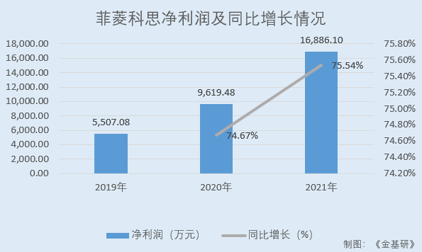 同期,菲菱科思的凈利潤分別為5,507.08萬元、9,619.48萬元、16,886.1萬元,2020-2021年分別同比增長74.67%、75.54%。