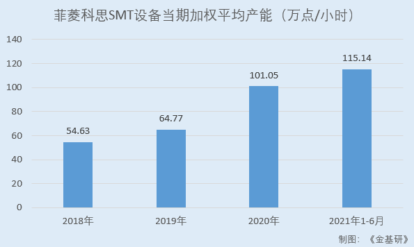 據(jù)招股書,2018-2020年及2021年1-6月,菲菱科思的SMT設(shè)備當期加權(quán)平均產(chǎn)能分別為54.63萬點/小時、64.77萬點/小時、101.05萬點/小時、115.14萬點/小時。