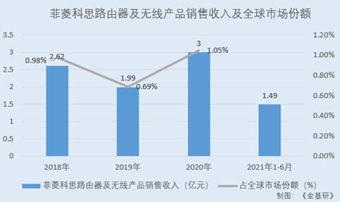 2018-2020年及2021年1-6月,菲菱科思的路由器及無線產(chǎn)品銷售收入分別為2.62億元、1.99億元、3億元、1.49億元。其中,2018-2020年,菲菱科思的路由器及無線產(chǎn)品銷售收入占全球市場份額分別為0.98%、0.69%、1.05%。