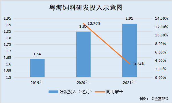 2019-2021年,粵海飼料的研發(fā)投入分別為1.64億元、1.85億元、1.91億元,2020-2021年分別同比增長12.76%、3.24%。