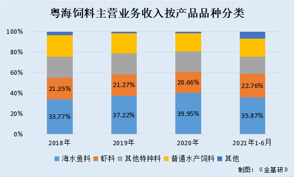 2018-2020年及2021年1-6月,粵海飼料的特種水產(chǎn)飼料銷售收入分別為39.48億元、39.92億元、47.09億元、19.52億元,占主營業(yè)務(wù)收入的比例分別為75.31%、78.93%、80.72%、75.71%。