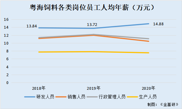 2018-2020年,粵海飼料研發(fā)人員的人均年薪分別為13.84萬元、13.72萬元、14.88萬元。同期,粵海飼料銷售人員的人均年薪分別為11.16萬元、11.97萬元、10.45萬元;行政管理人員的人均年薪分別為11.38萬元、12.17萬元、11.09萬元;生產(chǎn)人員的人均年薪分別為7.73萬元、7.82萬元、7.53萬元。