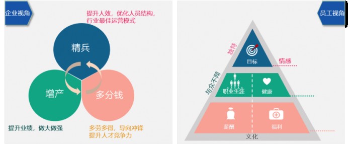 ·員工視角:上圖右邊部分展示了員工視角,模型就是ERP員工價值主張,不同層面的員工的價值的主張不同,但最后尊重的都是個體跟組織的同意,實現(xiàn)個人在組織中身心愉悅的終極目標。因此,只有個人的價值觀與組織文化相互吸引、達成認同,才能真正感召。