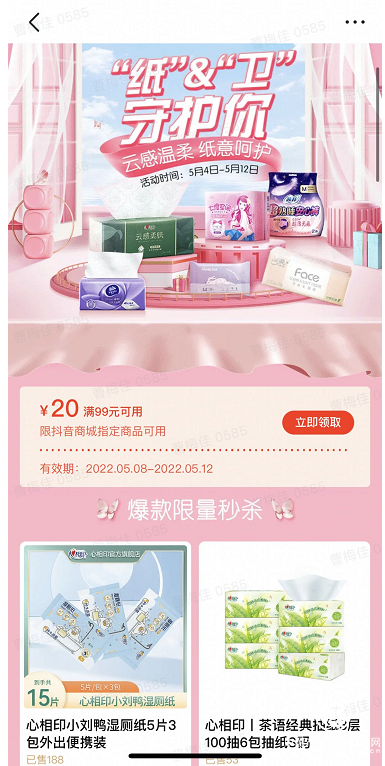 5月4日~5月12日,抖音電商開啟了第8期“紙”“衛(wèi)”守護你活動。本次活動期間,紙品衛(wèi)品品類成交額環(huán)比3月活動提升超50%,同比去年同期增長超過200%。